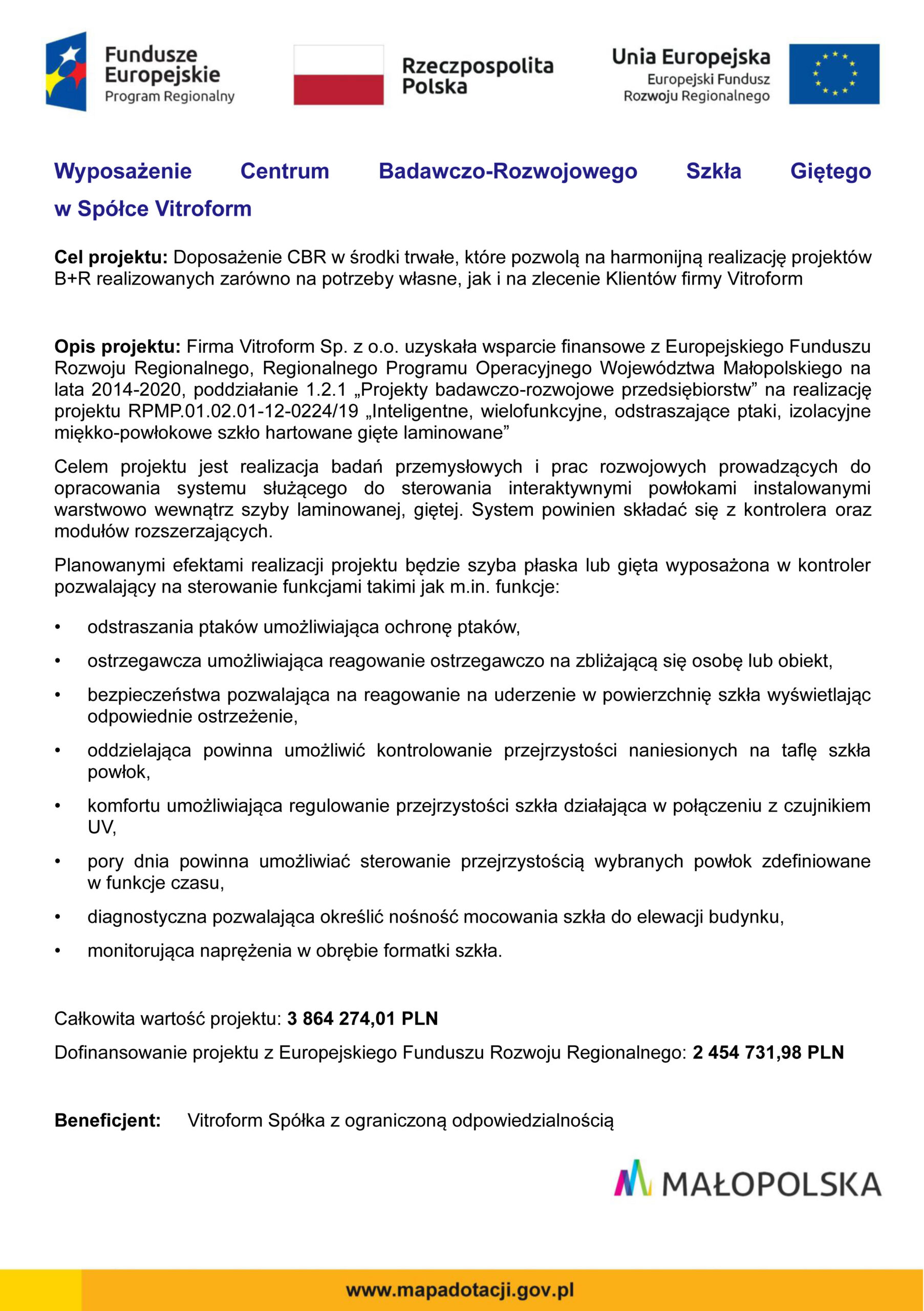 Firma Vitroform realizuje projekt numer PMT/1397/9N/1919 CAN w ramach Programu Operacyjnego Inteligentny Rozwój 2014-2020, oś priorytetowa III ”Wsparcie innowacji w przedsiębiorstwach”, Działanie 3.3 „Wsparcie promocji oraz internacjonalizacji innowacyjnych przedsiębiorstw”, Poddziałanie 3.3.1 „Polskie Mosty Technologiczne”.